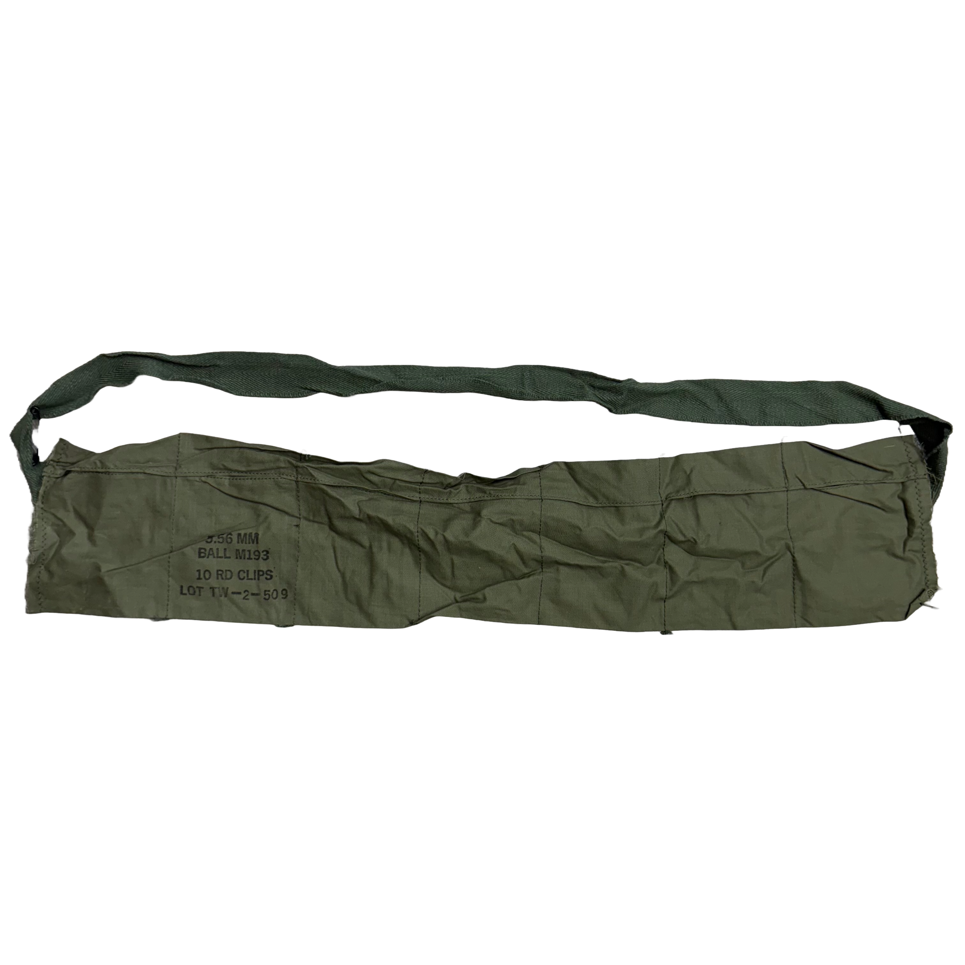 The M3 Bandoleer is a cotton fabric bandoleer featuring 7 pockets originally designed for holding 5.56 stripper clips/ammunition boxes. Soldiers quickly starting filling them with 20 round M16 magazines as well.