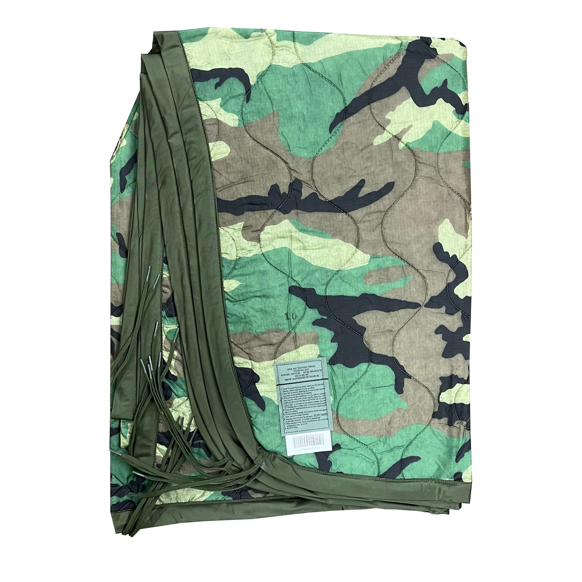 The poncho liner, or "woobie," is U.S. military field gear that ties into a standard issue poncho for extra warmth. It can also function as a blanket, sleeping bag, or protective cover. Constructed from quilted nylon and polyester fill, it attaches to the poncho via built-in laces that loop through eyelets.